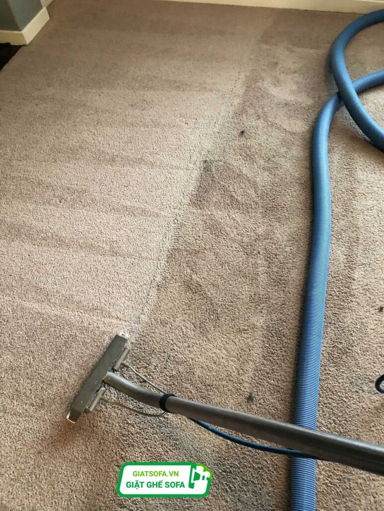 Bước 4: Giặt thảm bằng máy chuyên dụng Áp dụng công nghệ phun hút hoặc hơi nước nóng để làm sạch sâu.